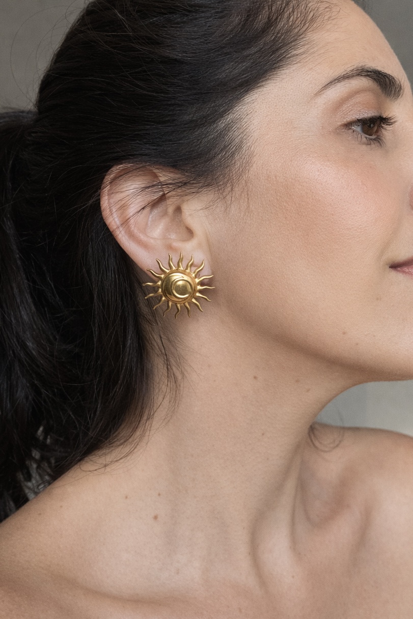 O Brinco Sol e Lua, em aço Inox com banho dourado e verniz cataforetico foi uma das peças escolhidas pela @de.brinco para trazer mais diversão, leveza e personalidade ao seu look.
